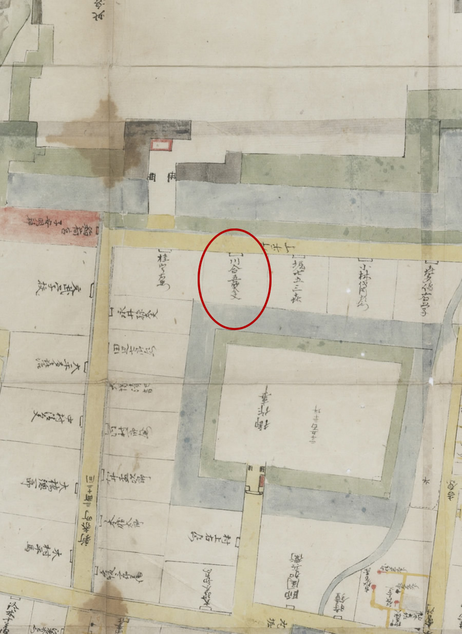 安政年間上田城下町絵図(上田市立博物館所蔵)に見る河合邸。二の丸橋と文武学校近くに「川合五郎太夫」の屋敷(赤丸部分)がある。