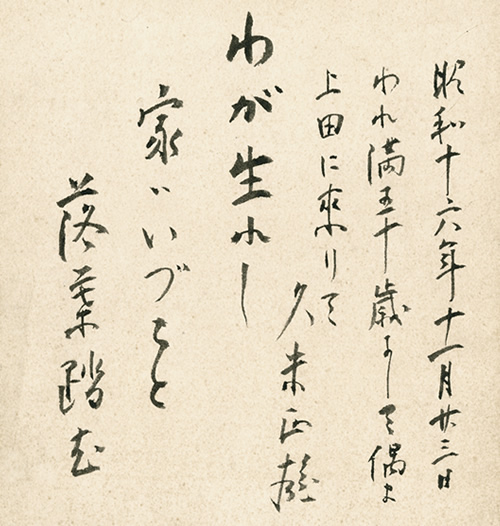 昭和16年11月、久米正雄が上田市で講演を行った折にしたためた色紙(河合家所蔵)。河合邸を訪れた際に、生家の跡地を見て詠んだものである。